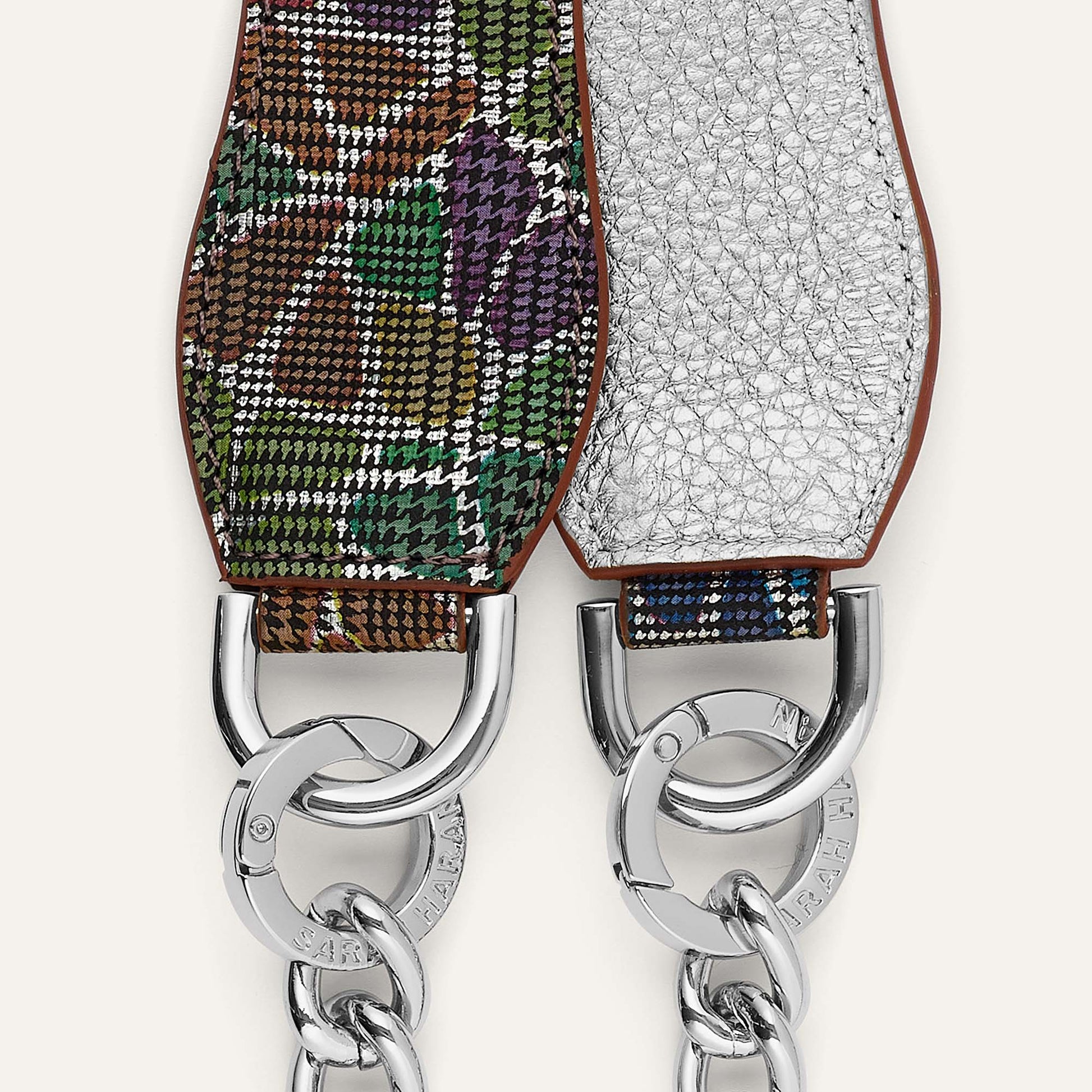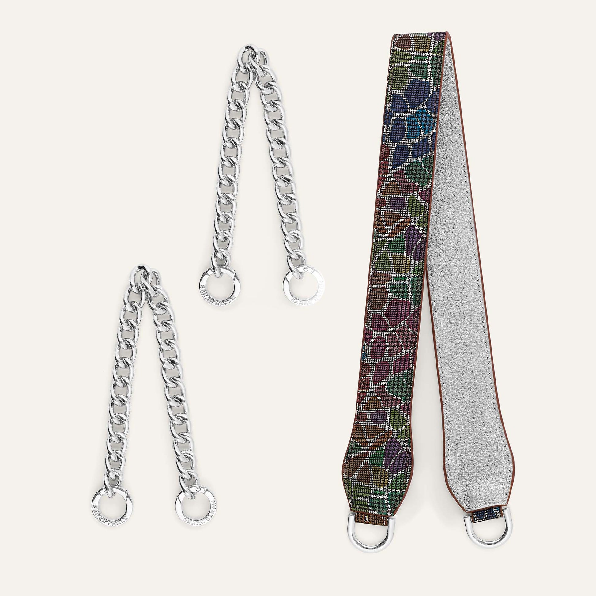 At Sarah Haran, we believe in versatility and personalisation. The Gemini Strap offers flexibility to your handbag for any situation. Whether you're heading to a business meeting, a casual day out, or a special event, the Gemini Strap ensures your handbag always complements your look.Fits all our handbags where there are D Rings. You can also remove the chain by simply opening the O rings and sliding the links off. Perfect if you want create a short handle strap to attach to a smaller bag. The unique texture of suede allows it to catch the light in different ways, giving it a rich, multidimensional appearance!